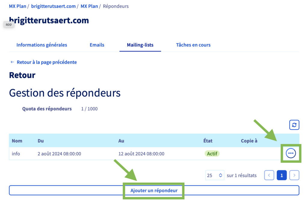 - Soit Modifier un répondeur existant en cliquant sur les 3 petits point à droite de ce répondeur