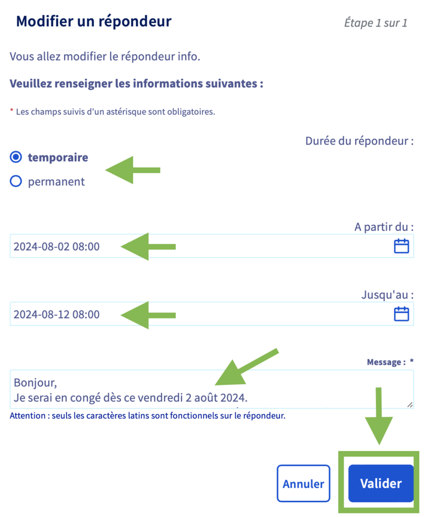 - Cocher si le répondeur est temporaire ou permanent