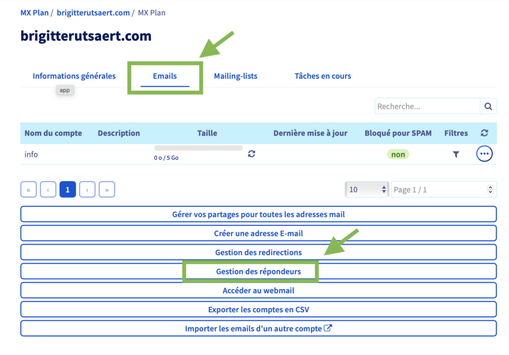 4. Ensuite, dans le menu, cliquer sur Emails > puis sur Gestion des répondeurs