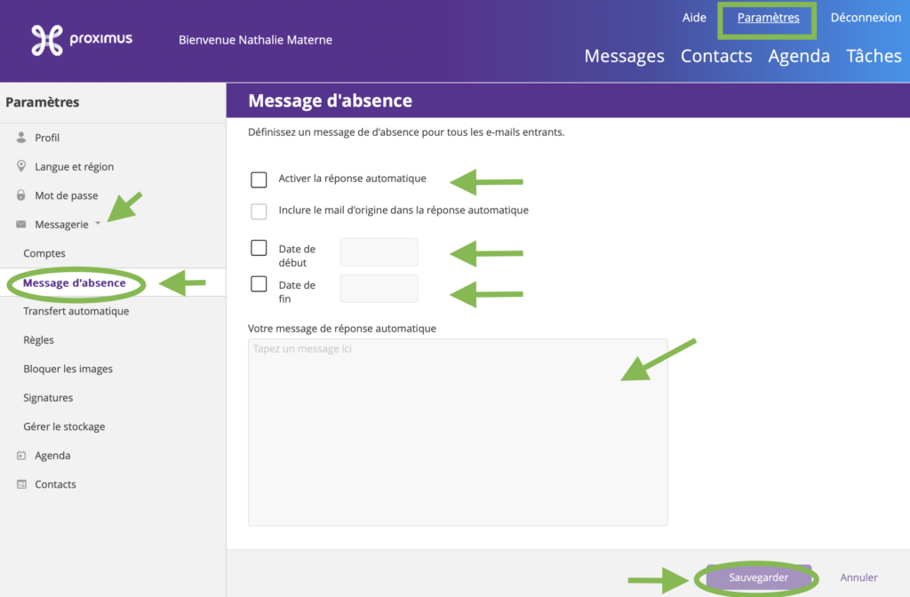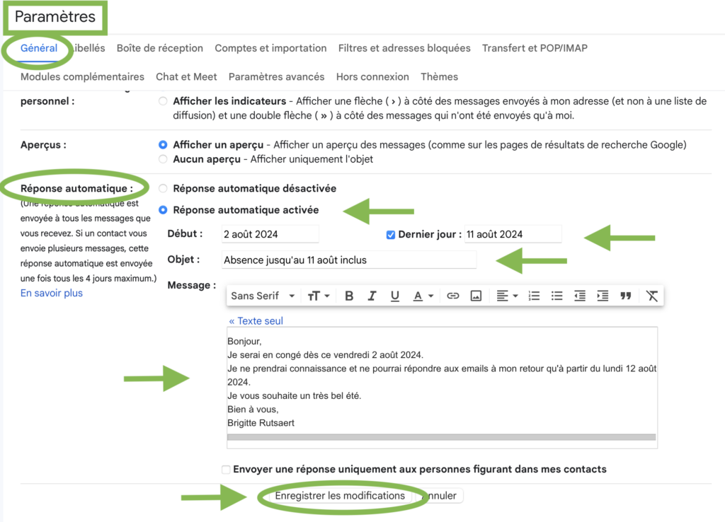 Remarque: les emails de vos correspondants arriveront bien dans votre boîte de réception dans l'attente que vous y répondiez, mais vos correspondants seront avertis que vous ne pouvez pas y répondre avant votre retour.
