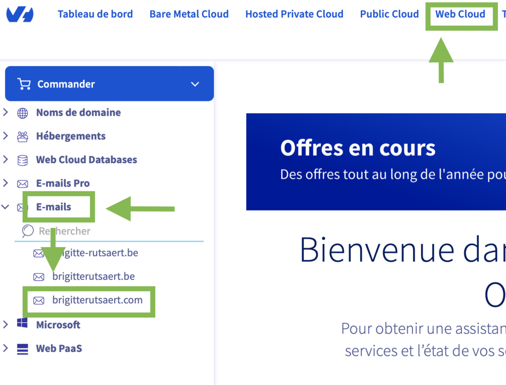 - Cliquer sur Web Cloud dans le menu du haut, puis sur Emails, puis sur 'adresse email concernée